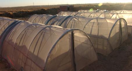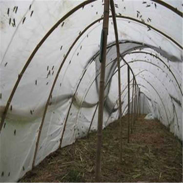 竹片的两头都埋在地下,地下还要用别的木头扎进去与竹片捆在一起以便牢固别被大风刮开,棚子要用立杆顶上,这样更结实.棚一般建4米X10米的,大小不是死规定。再就是要选用密致粗丝的纱网,一般好的纱网每斤是3----4平方米,<是用40目以上,丝径在25左右的>普通的纱网一斤能达到6---7平方米,因为薄的纱网不结实,大的蝗虫会撕咬纱网,稀的纱网会被弄的到处有小洞.小蝗虫会从一些小地方钻出来,一年下来就得换新的,好的纱布三年才需要换。